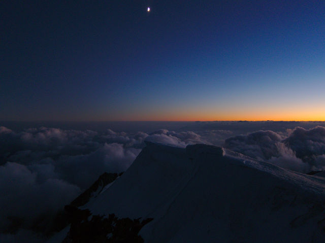 Traumhafter Sonnenuntergang auf der Signalkuppe / Punta Gnifetti (4554m): Die Sonne scheint mit den allerletzten Strahlen zwischen der Dent d\\\'Hérens (4178m) und dem Matterhorn (4477,5m).