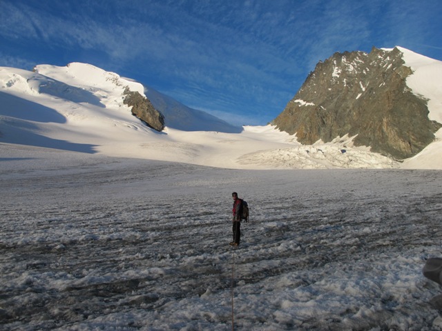 Von der Britanniahütte steigen wir zuerst 80m ab zum Hohlaubgletscher (2.950m), welcher nach Südwesten traversiert werden sollte, um unter dem Ausläufer des Hohlaubgrates über einen Schneesattel (P.3105) weiter zum Allalingletscher hinab zu gelangen.