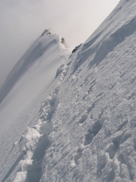 Der erste schöne Tag nach Regen und Schnee und wir marschierten zur Mischabellhütte. Erst dort oben war es aber schön und wir fühlten uns wie im Flugzeug, als wir die untergehende Sonne über dem Wolkenmeer erblickten. Die Wolkendecke war ca 10 Meter unter uns. Gegen 5 Uhr ging es am nächsten Morgen los. Wir mussten uns durch den teilweise knietiefen Schnee eine Spur treten. Die anfänglichen Wolken lösten sich langsam auf und als wir am Gipfel ankamen hatten wir einen herrlichen Blick. Leider war es zu dritt da oben sehr eng, aber schön wars. Die Seilschaften des nächsten Tages werden dankbar für die Spurarbeit sein.