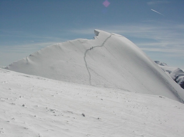 Mit Schneeschuhe bis auf 3980m zum Bergschrund an der Südflanke, anschliessend steiler über harten Firn mit Steigeisen auf den Gipfel. Bis zum nächsten grossen Schneefall weiterhin gut machbar. Trotzdem ist der Gipfel nichts für Sonntagsspaziergänger!