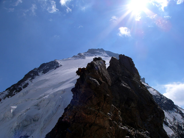 Ein schmaler Grat führte von hier zur nächsten Lücke. Da viel Schnee lag, folgten wir jetzt nicht - wie im Führer beschrieben - dem Grat, sondern nutzten den guten Firn in der Nordseite und betraten den Grat erst wieder im oberen Drittel. In leichter Kletterei erreichten wir die "Schulter" (ca. 4040m). Von hier aus folgten wir immer direkt dem Grat und wichen nur am letzten Überhang vor dem Horn auf die S-Seite aus. Das Horn kann sowohl südseitig umgangen als auch direkt überklettert werden. Wir entschieden uns für letzteres und gelangten schließlich über einen letzten, schmalen Grat vom Horn zum Gipfel. Nachdem die Gipfelbilder geschossen waren, suchten wir uns ein Plätzchen auf der sonnenbeschienen S-Seite und genossen den tollen Ausblick.