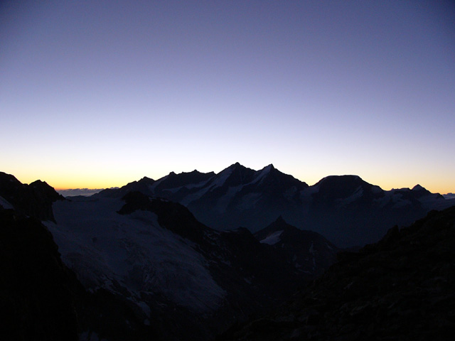 Abmarsch war um 4:05 Uhr. Anfangs ging es über den Triftgletscher in großem Bogen hinauf zum Einstieg der Wellenkuppe bei etwa 3650 m. Ab hier teilten wir uns in zwei Seilschaften auf. Wir kletterten über die leichte aber sehr brüchige Flanke hinauf zum Grat. Dieser war sehr schön zu klettern aber leider viel zu kurz. Und so erreichten wir um 7:20 Uhr die Wellenkuppe.