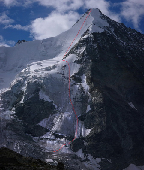 Ausgangsort: Zinal / Hütte: Cabane du Mountet 2886m / Aufstieg vorerst über die Coeur - Route zum Firnplateau auf ca. 3500 m, dann mittels Firnbrücke den Schrund überquert und in der Direttissima hochgestiegen. Weil sehr gute Verhältnisse herrschten, konnte die Wand in 2h 50 min erklettert werden. Um einen Mitreissunfall zu vermeiden, wurde nicht angeseilt. Eigensicherung mit 2 Steileisgeräten. Wir stiegen 20m rechts vom Gipfel aus der Wand aus und stiegen über den Firngrat die letzten paar Meter hoch zum Gipfel. / Abstieg über den Coeurgrat zur Cabane du Mountet