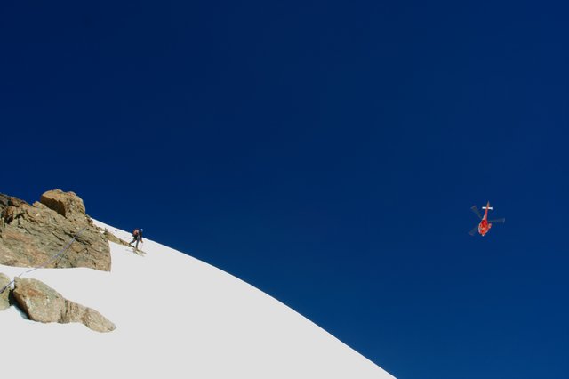 Weiters ging es erst dem Gratverlauf entlang, um wenig später nach links in die Flanke zu schwenken. Es schloss sich kurz darauf die technisch schwierigste Stelle an, bei welcher ein ca. 5-7m hoher Absatz (II+) erklettert werden wollte. Hier oben gibt es auch einen Haken als Abseilstelle für den Rückweg. Anschließend querten wir linker Hand Pfadspuren folgend horizontal auf einem schmalen Felsband, bis es möglich wurde, den Rücken bei Pt. 3506 in leichter Kletterei (I) zu gewinnen. Nun gab es eine kurze Trinkpause, um uns erneut mit den Eisenwaren zu bewaffnen. Der weitere Verlauf war dann selbsterklärend; man folgt auf gutem Trittfirn dem langgezogenen, langsam steiler werdenden Rücken, quert unter den hoch über einem aufragenden, mächtigen Gipfelwechten des Rottalhorns hindurch, bis man schließlich kurz vor dem Rottalsattel am stets gerne genutzten Materialdepot ankommt.