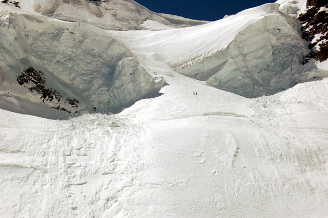 Rückblick in die sehr steile Direktabstiegsroute zwischen den Gletscherabbrüchen hindurch.