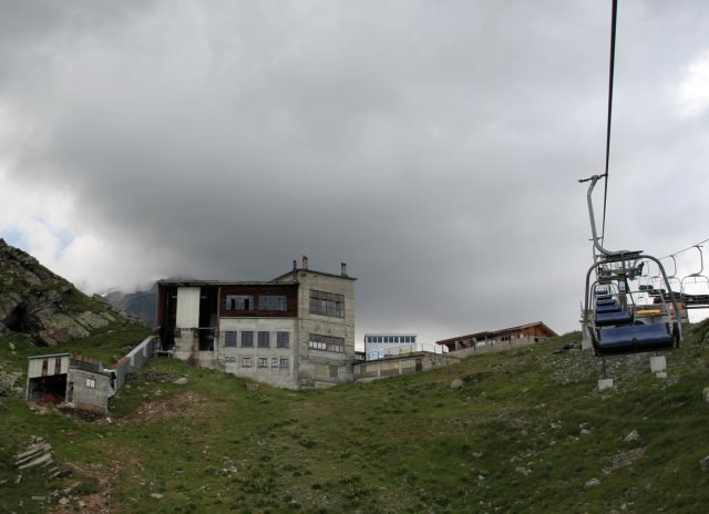 So starteten wir morgens im Talort Alagna Valsesia mit einer der ersten Seilbahnen zur Punta Indren. In drei Etappen erspart uns der Lift 2000 Höhenmeter und langes Wandern durch die Skipisten des "Freeride Paradise". Die moderne Kabinenbahn im Talort verdient noch ihren Namen, doch dann die erste Überraschung des Tages: Den zweiten Abschnitt legen wir im offenen Sessellift zurück, das letzte Stück nach Punta Indren in einer klapprigen Seilbahn: Eine Reepschnur hält die Türen zu, die Station hat den Charm eines Bunkers aus dem Krieg. Auf der Bergstation marschieren wir durch ein Labyrinth von Gängen. Der Geruch von Öl erinnert an einen Autofriedhof.