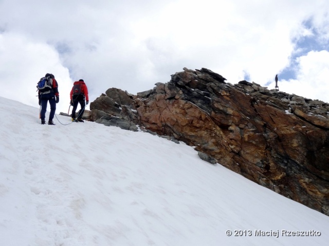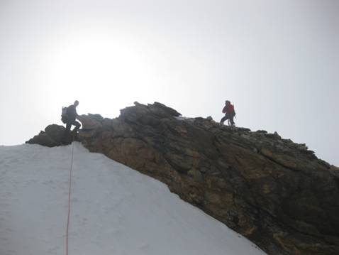 Nachdem wir auf dem Sattel zur Vincentpyramide sind, müssen wir nur noch ca. 3m hochklettern und befinden uns sogleich auf dem sehr kleinen und schmalen Gipfelgrat der Punta Giordani (4.046m).