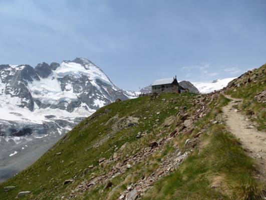 Um 07:00 Uhr bringt mich der Hotelshuttle nach Zermatt (1.608m). Von dort gehe ich auf meine 1. Akklimatisationstour und wandere in 4h bei weit über 30°C knapp 1.100 Höhenmeter zur Schönbielhütte (2.694m).
