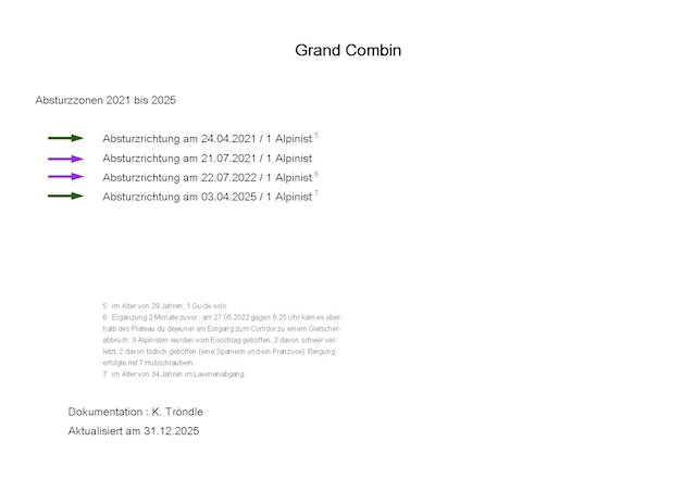 Zum ersten Mal ist mir die Südseite des Grand Combin aufgefallen, als im Jahr 1982 sich neben dem tödlichen Absturz meines Freundes auf der Nordseite, im gleichen Jahr ein weiterer tödlicher Absturz auf der Südseite ereignete. Auch in den darauffolgenden Jahren kam es immer wieder auf der Südseite zu tödlichen Unfällen. Eine Dokumentation hierüber konnte aber bis dato nicht aufgefunden werden, doch lassen einzelne Schilderungen im Zusammenhang erkennen, daß die Absturzserie mehr oder weniger lückenhaft zumindest bis in das Jahr 1982 zurückreicht.