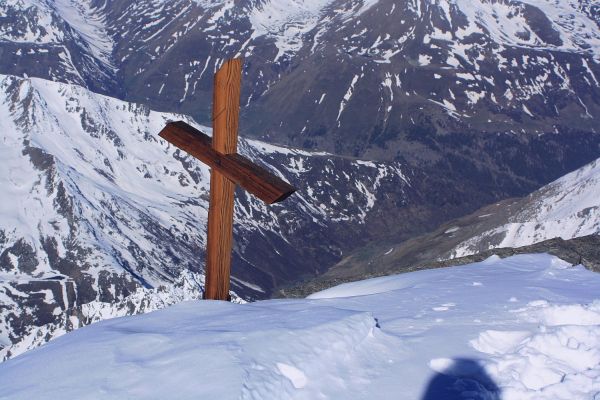 Das kleine Gipfelkreuz auf dem Grand Combin de Valsorey (4184m) - dahinter das grüne Val d'Entremont.